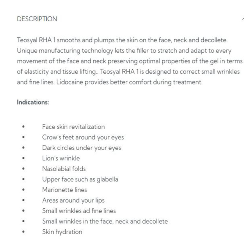 Packaged in two 1ml syringes, Teosyal RHA 1 is perfect for clients seeking subtle enhancements and natural-looking results. The treatment areas include the forehead, eye area, perioral zone, cheeks, neck, and décolleté, focusing on fine lines such as crow’s feet, forehead folds, and nasolabial folds.