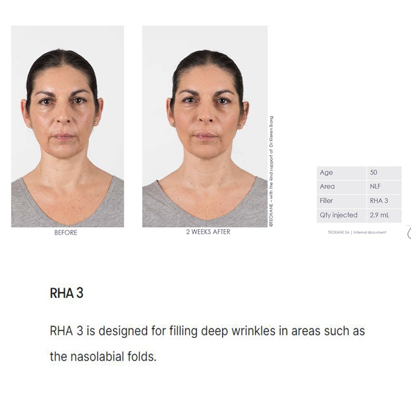 Teoxane Teosyal RHA 3 represents a new generation of dermal fillers tailored to support skin elasticity and address medium to deep facial wrinkles and folds. Its 23mg/ml hyaluronic acid concentration, combined with 3mg/ml lidocaine, offers a filling effect that complements the skin’s natural movement, thanks to Teoxane’s pioneering Resilient Hyaluronic Acid (RHA) technology.